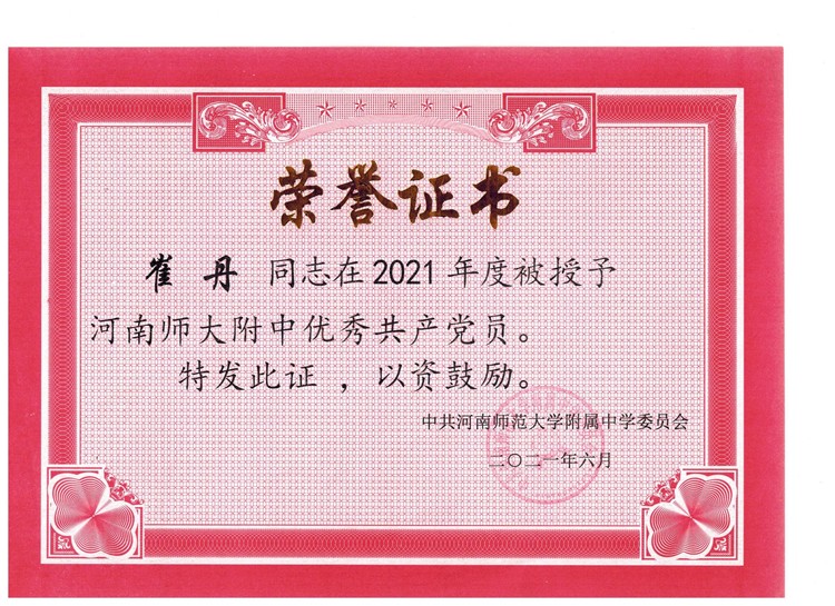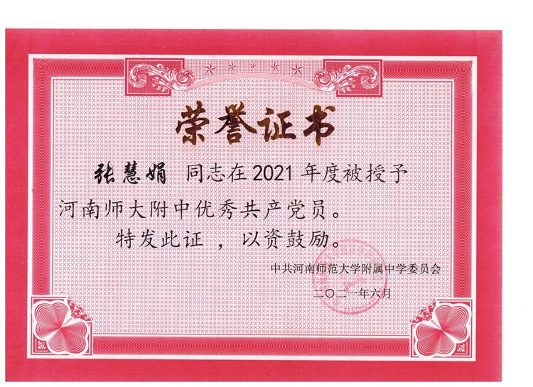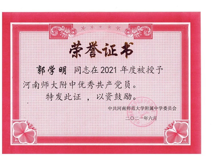 祝賀我校郭學(xué)明、崔丹、高亞超、閆曉穎、王曉慧、張慧娟等老師被評(píng)為河南師大附中“優(yōu)秀共產(chǎn)黨員”榮譽(yù)稱號(hào)。
